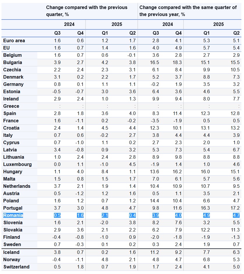 • Raportat la prețul nominal (valoarea în moneda în care se efectuează tranzacțiile), Portugalia a consemnat cea mai mare creștere, de 17,2% (14,3%, real), urmată de Bulgaria (15,5%, respectiv 14,1%, real).