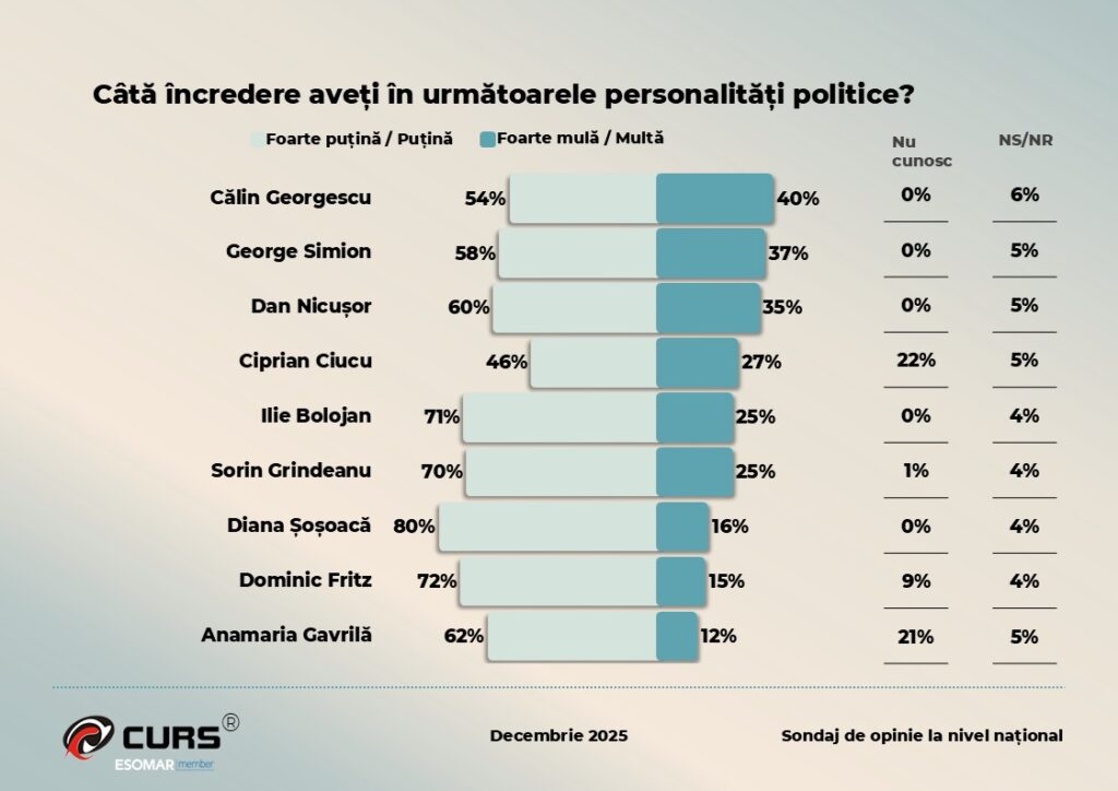 Un sondaj CURS efectuat în perioada 10-19 decembrie a.c. pe 1.067 persoane, cu marjă de eroare de 3%, arată că 75% dintre români sunt de opinie că România se îndreaptă într-o direcție greșită, doar 21% apreciind că țara este pe o direcție bună. 40% dintre cei întrebați au afirmat că au multă sau foarte multă încredere în Călin Georgescu, dar 54% au puțină sau foarte puțină încredere.