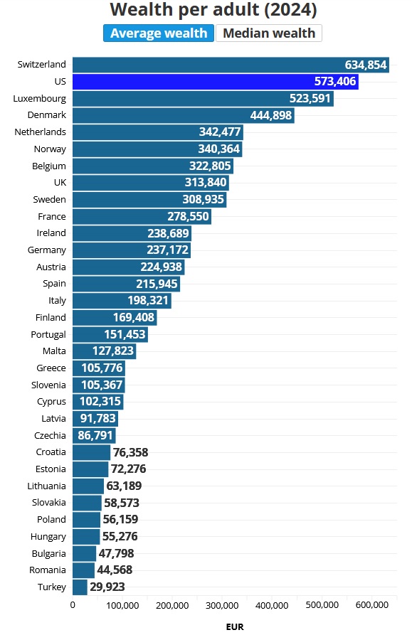 În clasamentul general, Elveția și Luxemburg sunt singurele țări cu o avere medie per adult de peste 500.000 de euro. Danemarca ocupă locul al treilea, urmată de Țările de Jos, Norvegia, Belgia, Regatul Unit și Suedia. În rândul marilor economii europene, Regatul Unit conduce, în timp ce Italia are cel mai scăzut nivel al averii medii dintre acestea.