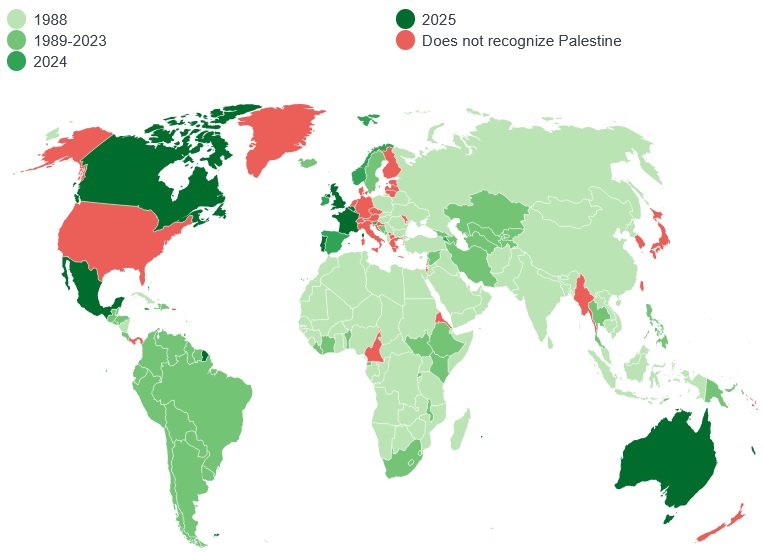 • Luni, 22 septembrie, în timpul Adunării Generale a Organizației Națiunilor Unite de la New York, Franța, Belgia, Luxemburg, Malta și Andorra au declarat că recunosc Statul Palestina. Cu o zi înainte, Regatul Unit, Canada, Australia și Portugalia recunoscuseră, de asemenea, Palestina.