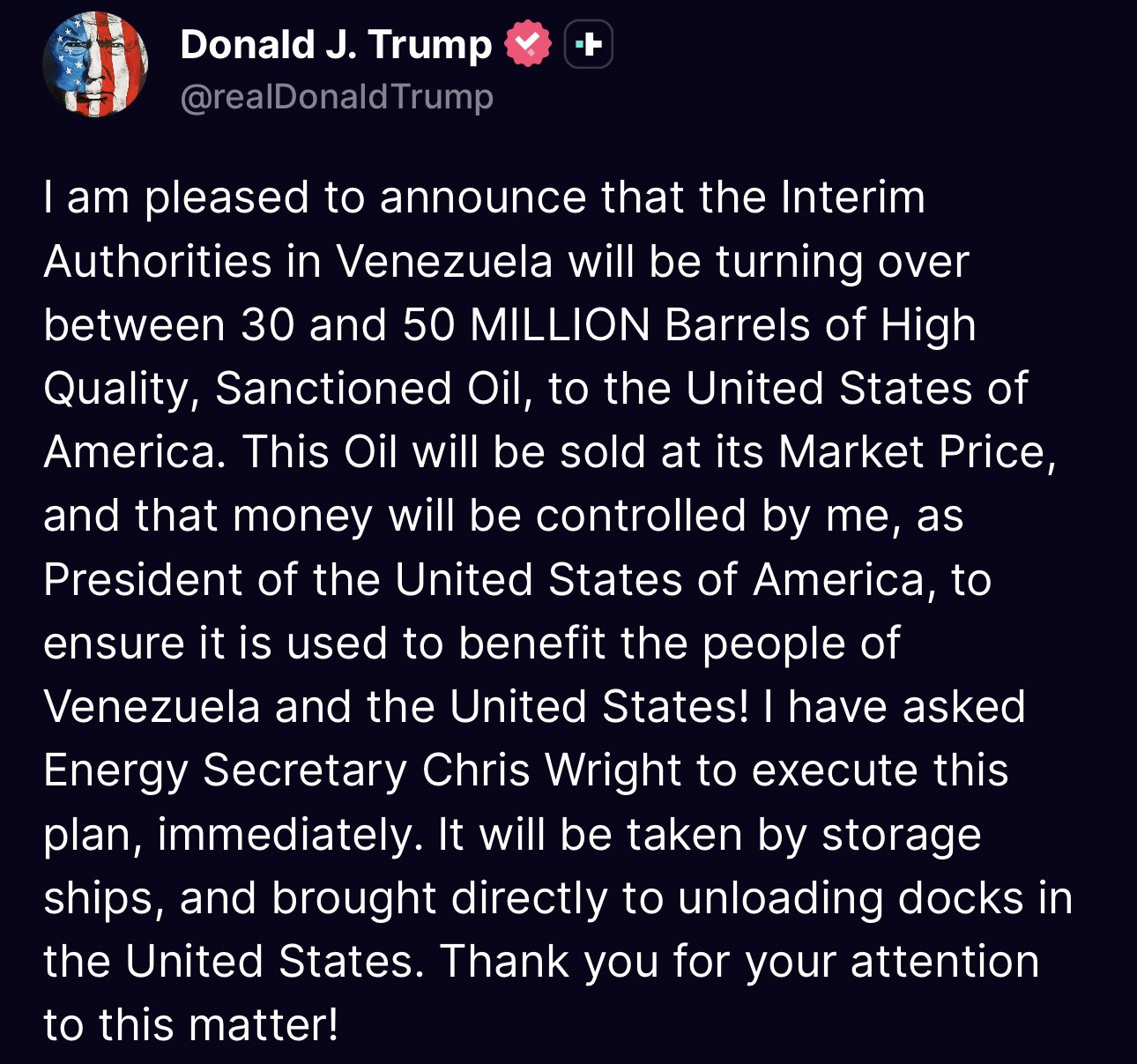Într-un alt mesaj stupefiat pe o rețea socială, președintele SUA, Donald Trump, a anunțat marți intenția de a rafina și vinde între 30 și 50 de milioane de barili de petrol venezuelean blocați anterior de sancțiunile americane, un semnal clar că SUA cooperează cu structurile rămase ale guvernului venezuelean după capturarea lui Nicolás Maduro. Mai mult, Trump afirmă că va controla personal banii rezultați din vânzarea petrolului!
